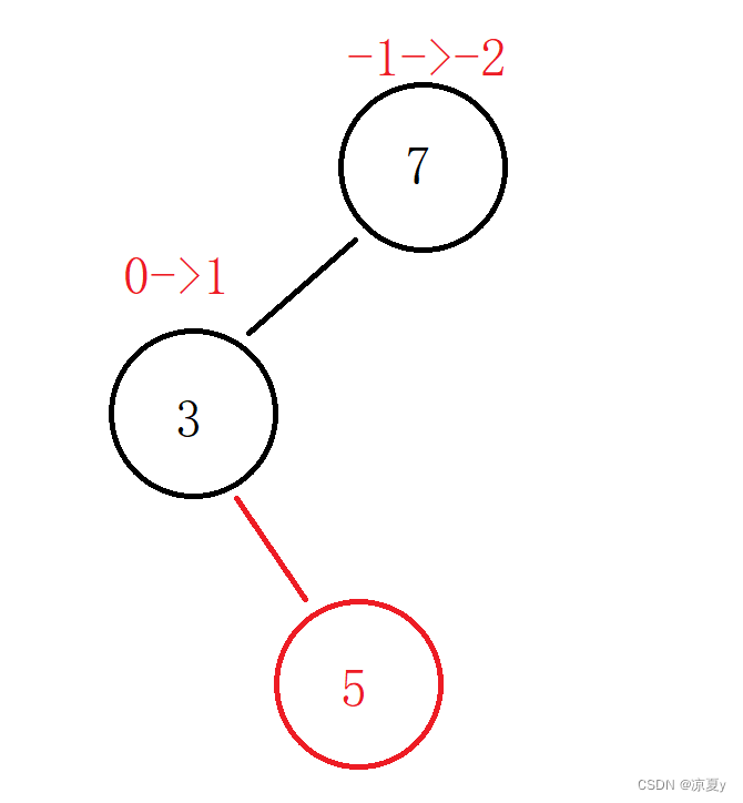 当平衡因子变为-2或者2时,说明左右子树高度差相差为2,高度不平衡,这种时候,就需要进行旋转来平衡高度了。例如下图插入5后,3的平衡因子变为1,继续向上调整,7的平衡因子由-1变为-2。