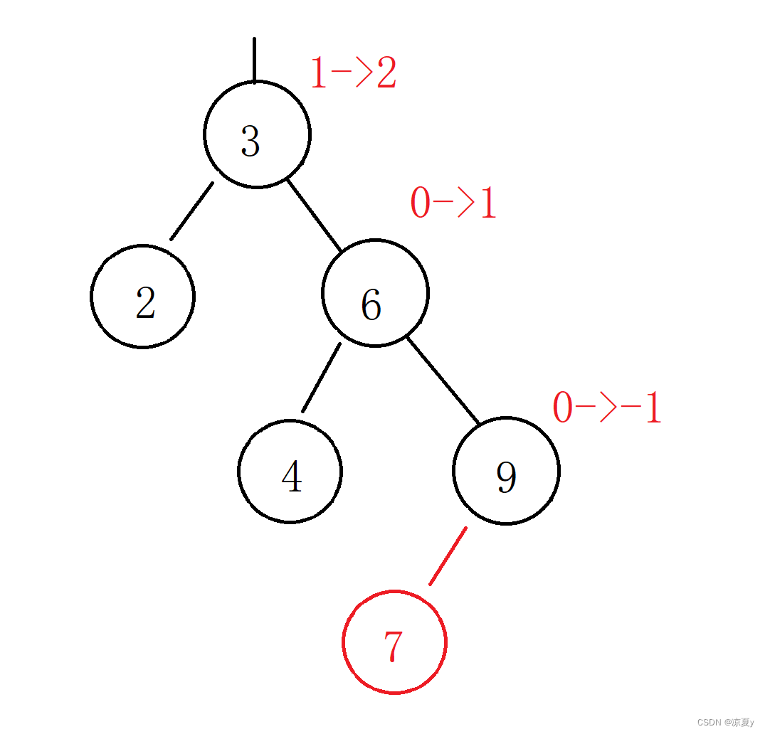 例如上面的例子,我们在7的左子树进行插入,那么最终6的平衡因子是0,9的平衡因子是-1,所以我们需要调整9的平衡因子。所以在代码实现中,我们可以记录插入后7的平衡因子,这样就知道新节点到底插入在了7的左子树还是右子树上,以便决定最终我们要调节哪个节点的平衡因子。