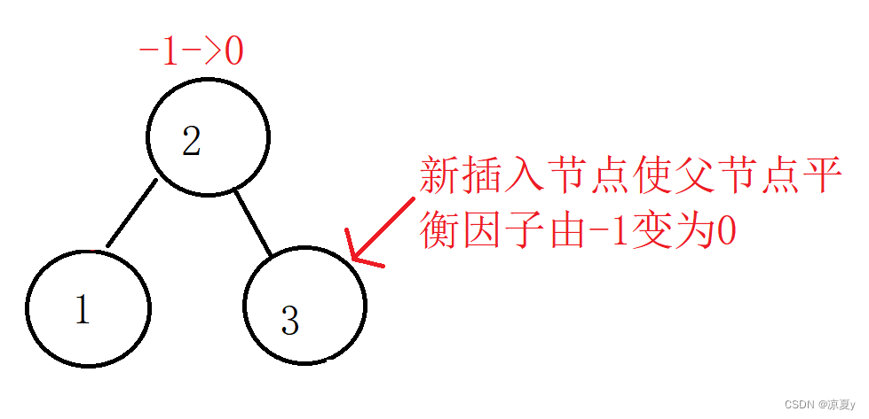 这种情况下,由于插入一个新节点,父节点的平衡因子只能增加1或者减少1,所以父节点原来的平衡因子必定是1或者-1。那么,这样的插入实际并没有改变以父节点为根的子树的高度。因为很明显,新插入的节点只是将这棵树矮的那一边填上了一个节点,并不会让整棵树的高度增加。就像上面的树的高度在插入3前后都是2一样。