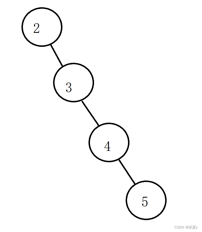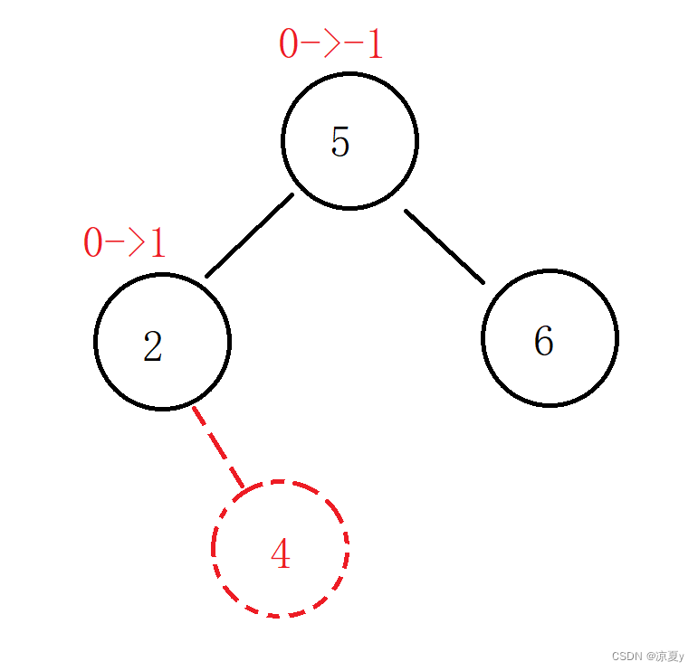 在这种情况下,父节点的平衡因子原来一定是0,也就是说父节点的左右子树高度是平衡的,而向这样的一颗树里插入一个节点,就会导致其高度增加。例如下图中以2为根节点的子树的高度在插入前为1,而插入后为2。所以以2为根的子树的高度增加了1,这就导致5的左子树高度增加1,影响了5的平衡因子。所以这种情况下调整完2的平衡因子之后,应该继续向上调整祖父节点的平衡因子。