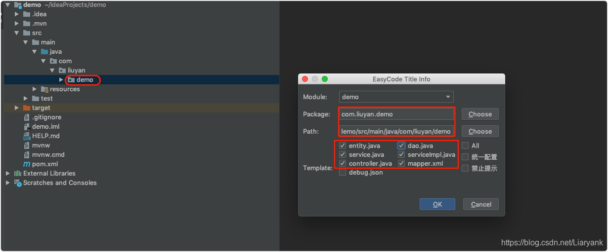 选择你要将生成的代码放入对应的包和路径中,选择完以后点击OK。