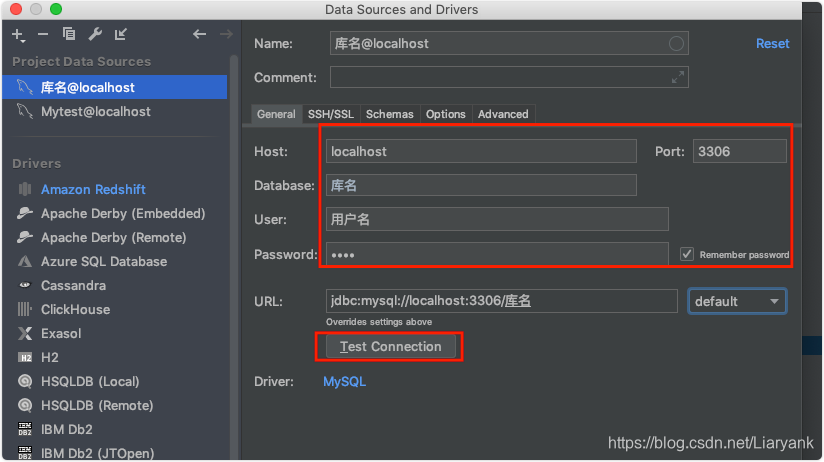 然后填写自己的数据库名字,用户名,密码。点击OK。IDEA连接数据库就完成了。