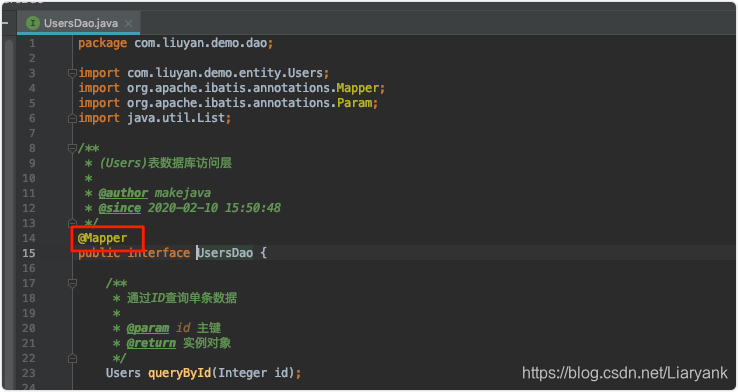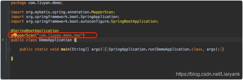 在启动类里面加上@MapperScan("com.liuyan.demo.dao")注解。