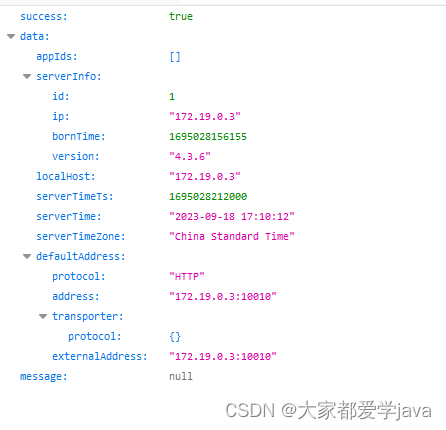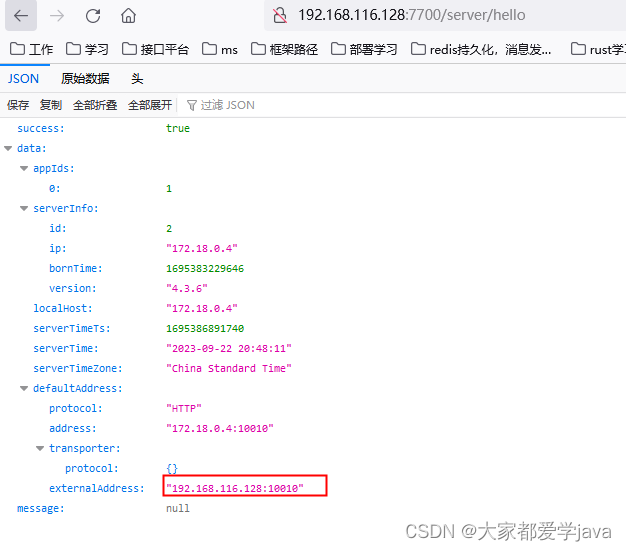 然后我访问http://192.168.116.128:7700/server/hello,把ip换成你的ip地址,神奇的出现了,我本来server是192.168开头的,访问这个ur,赫然发现成了172.19。