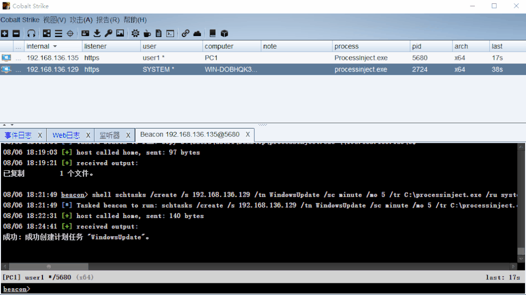 此时提示”成功: 成功创建计划任务 “WindowsUpdate”,5分钟后,域控以system权限自动上线。