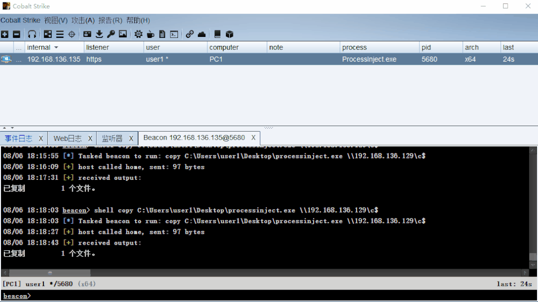 窃取令牌后,代表我们与域控已经打通,我们将上传一个木马进域控c盘。