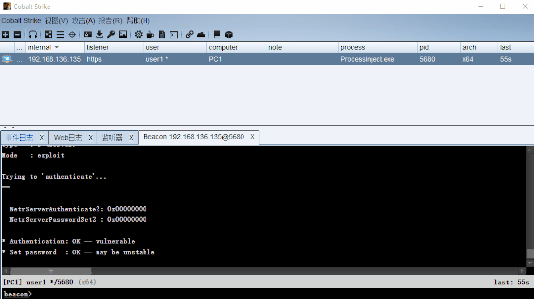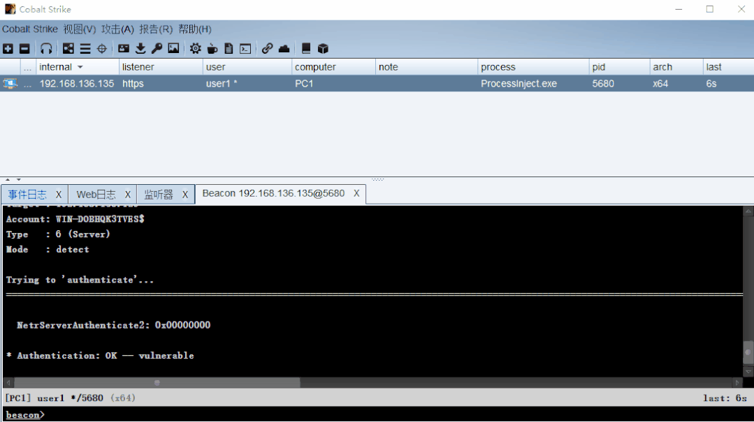 接下来我们将尝试测试域控的漏洞,用的最多的是zerologon漏洞,顾名思义,该漏洞分为zero和logon两部分构成,意思就是将密码置空,然后登陆。该漏洞通杀未打补丁的server2008到2019,目前已经集成到cobaltstrike的mimikatz中。
