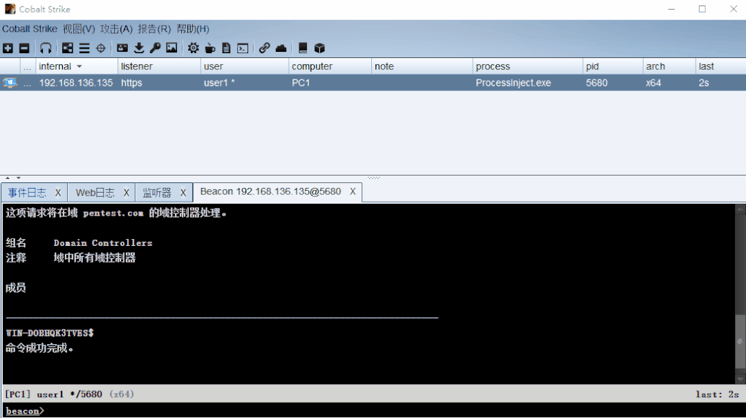 接下来我们发现该主机在域内,通过ping和net命令获取了域控ip地址和主机名。