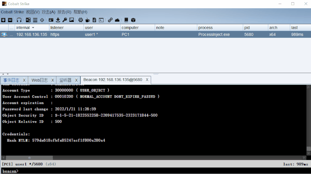 此时回显Hash NTLM: 579da618cfbfa85247acf1f800a280a4,这代表成功读取了了administrator的hash值,那么接下来我们将使用该hash值横向移动登录至域控。