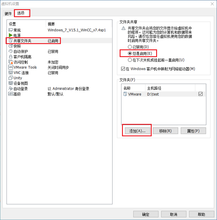 选择“选项”依次点击共享文件夹、总时启用。单击添加按钮,进行添加物理机上的文件夹。