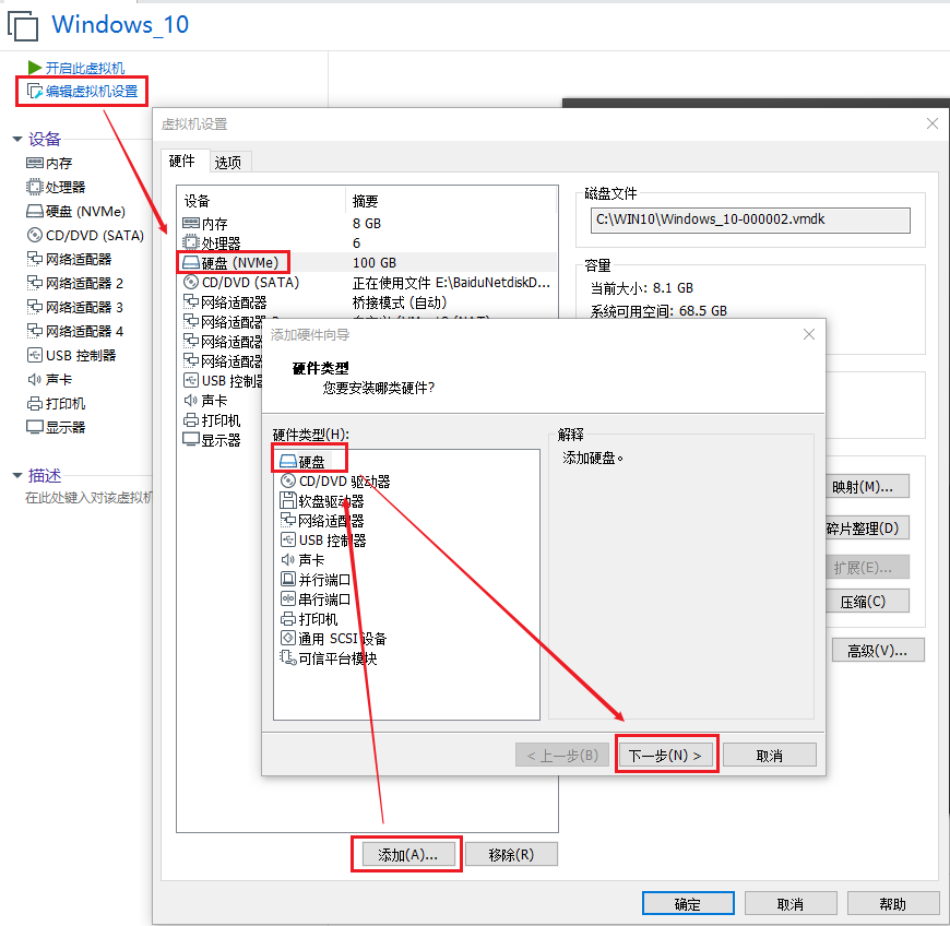 创建虚拟机时,会预先安装一个磁盘,类似我们电脑的C盘。后续有需要,仍然可以继续添加虚拟的硬盘,操作步骤如下所示。