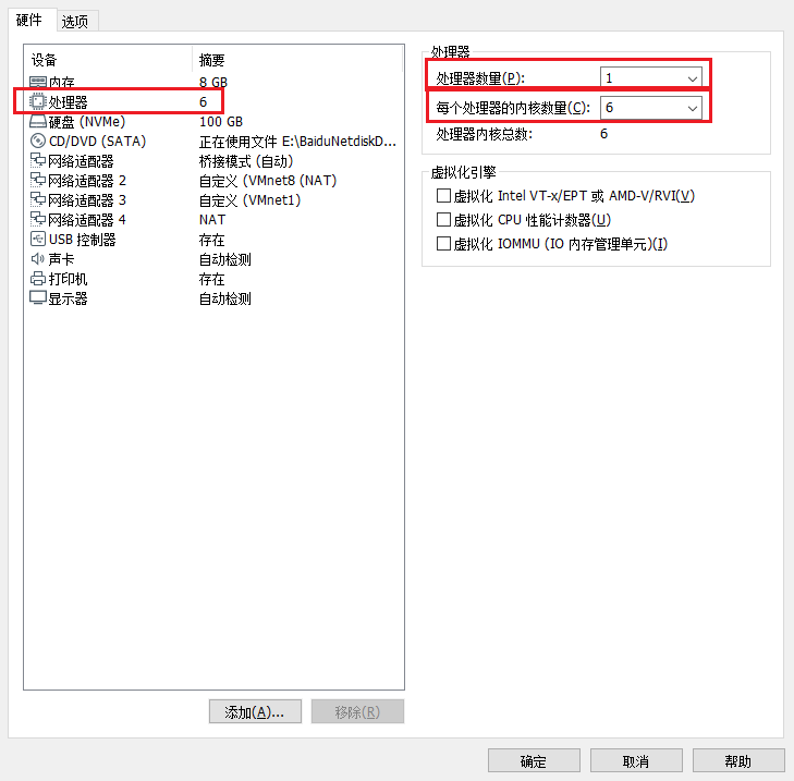 每个处理器的内核数量建议设置成主机线程的一半,如果你的主机处理器内核较多也可以按照主机和虚拟机1:2进行分配,这样能使虚拟机拥有更好的性能。