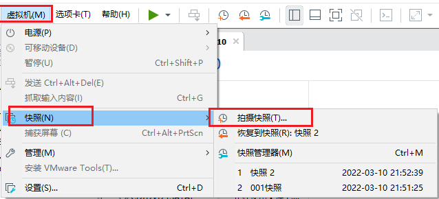 快照的设置很简单,只需要选中需要快照的虚拟机,然后依次选中虚拟机->快照->拍摄快照。