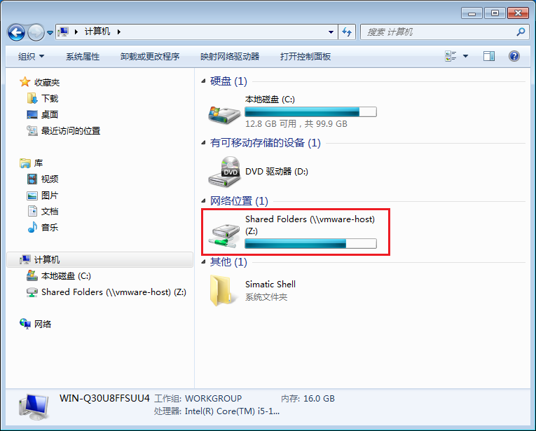 添加完共享文件然后在开虚拟机,打开windows的资源管理器,会在网络目录下看到一个名为“Vmware host”的远程主机,