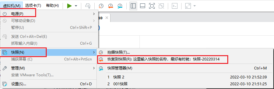 快照恢复操作同样通过选中虚拟机后点击右键,选择需要恢复的快照文件即可。