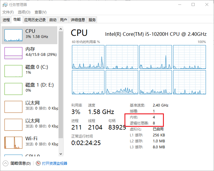 在任务管理器中可以查看主机的核心和线程数。