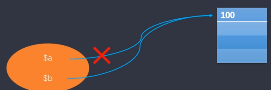 将赋值表达式内存空间的引用赋给另外一个变量,简单地将一个&符号加到将要赋值的变量前(共享一个房间),改变其中一个变量的值会影响另一个变量。