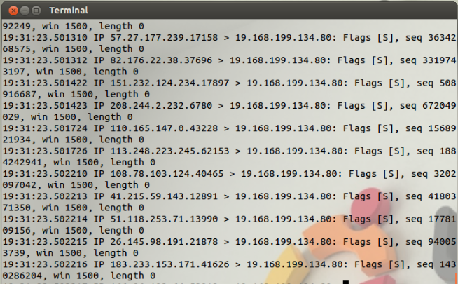 此时靶机的80端口会接收到大量不同来源的syn包