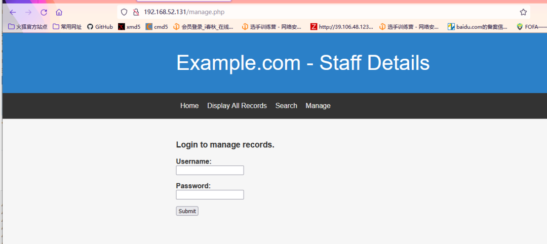 我们可以看到是一个登录页面,看来需要我们进行登录,但是不知道用户名和密码,我们对页面进行探测