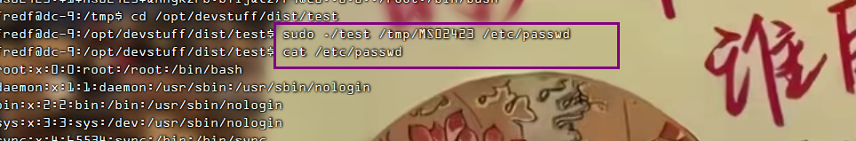 再回到/opt/devstuff/dist/test目录,执行程序test,将MS02423的文件内容写入到/etc/passwd文件里面