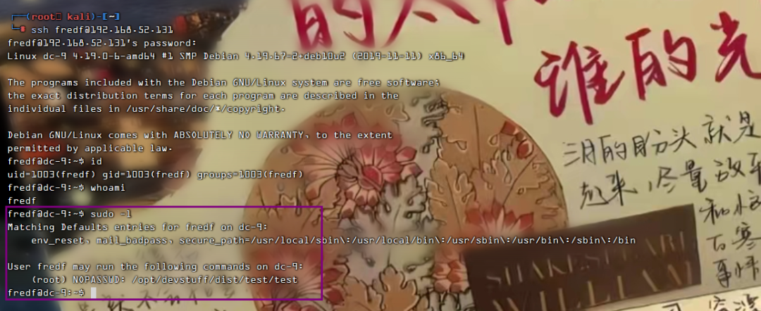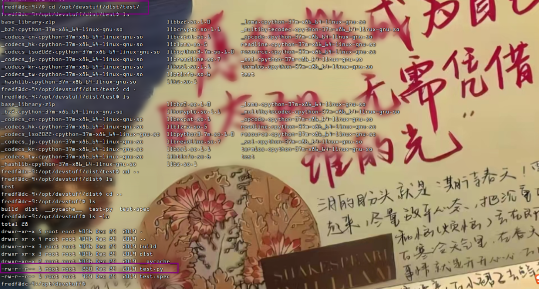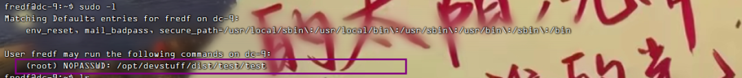 发现这里有个脚本文件可以无密码以root用户权限执行,我们进入/opt/devstuff/dist/test目录下先看看有什么信息,全是文件,回到上一个目录查看,也没什么,再回到上一个目录查看,在/opt/devstuff目录下发现了一个test.py脚本文件