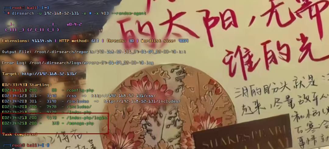 我们可以看到扫描到2个有用的信息,一个/inex.php/login,一个/manage.php