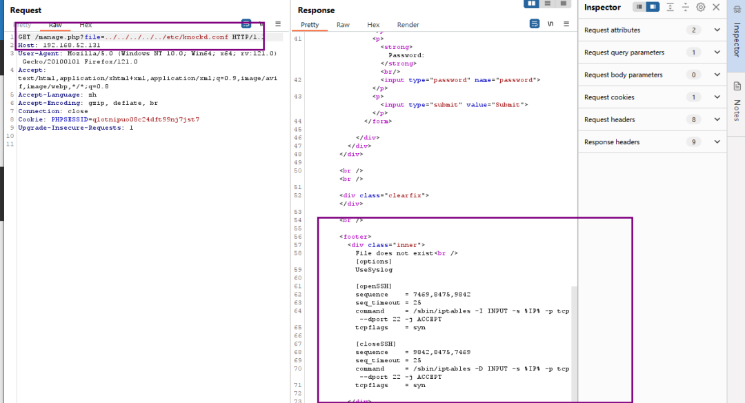 考虑到ssh端口是关闭的,可能是开启了knock服务(参考端口敲门服务),利用文件包含确认一下,一般开启了knock服务就会存在/etc/knockd.conf文件