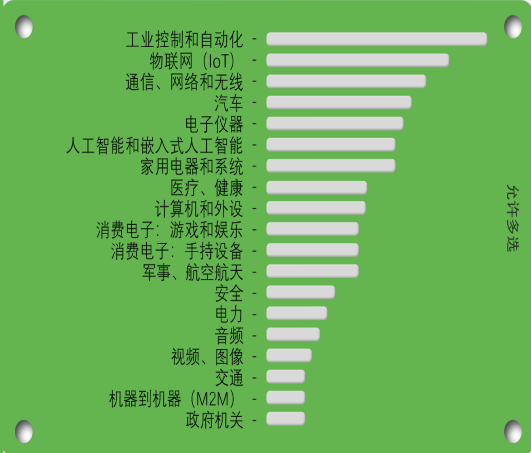 2023年的一项调查[1]表明,大多数嵌入式项目都是针对工业自动化、物联网(IoT)、通信和汽车应用开展的。下图中,作答者可以多选他们参与开发的应用种类。