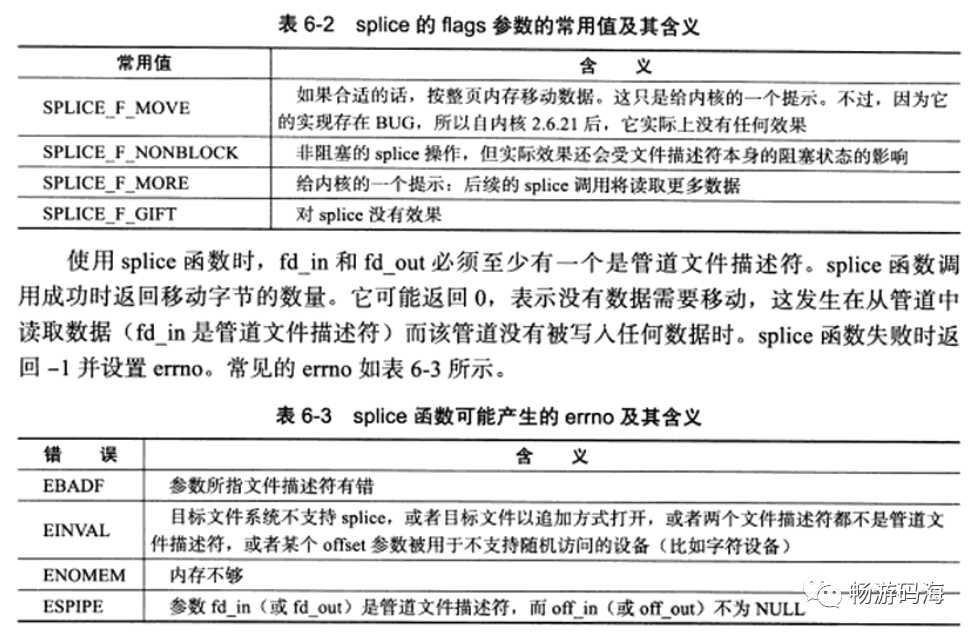 `//用来在两个文件描述符之间移动数据----零拷贝 #include<fcntl.h> ssize_t splice (int fd_in ,loff_t* off_in ,int fd_out , loff_t* off_out,size_t len, unsigned int flags); //fd_int 如果是管道文件描述符,则off_in设置NULL。如果不是,则off_in参数表示从输入数据流的何处开始读取数据,不为NULL则表示具体的偏移位置,fd_out和off_out同理,len参数指定移动数据的长度`