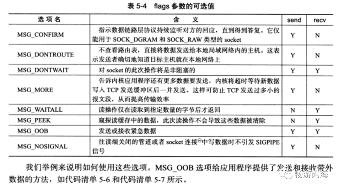 `#include<sys/types.h> #include<sys/socket.h> ssize_t recv (int sockfd , void *buf ,size_t len ,int flags); //recv读取sockfd上的数据,buf和len参数分别指定读缓冲区的位置和大小,flags参数的含义见后文,通常设置为0即可。 成功返回实际读取到的数据的长度,它可能小于我们期望的长度len。因此我们可能要多次调用。 返回0,这意味着通信对方已经关闭连接了,出错时返回-1,并设置errno。 ssize_t send (int sockfd , const void *buf ,size_t len,int flags);//send往sockfd上写入数据,buf和len依然是缓存区的位置和大小。send成功时返回实际写入的长度,失败则返回-1,并设置errno。`