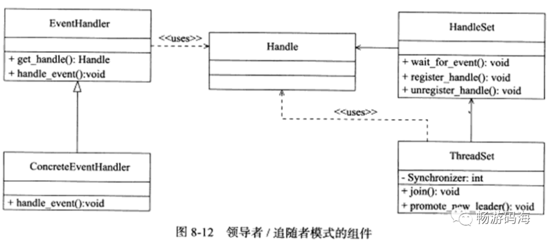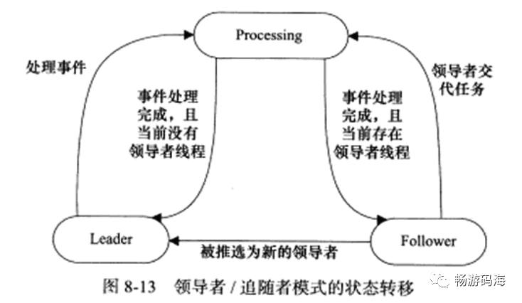 Leader:线程当前处于领导者身份,负责等待句柄集上的I/O事件Processing:线程正在处理事件。领导者检测到I/O事件之后,可以转移到processing状态来处理该事件,并调用promote_new_leader方法推选出新的领导者:也可以指定其他追随者来处理事件,此时领导者的地位不变。当处于processing状态的线程处理完事件之后,如果当前线程集中没有领导者,则它将成为新的领导者,否则它就直接转变为追随者Follower:线程当前处于追随者身份,通过调用线程集dejoin方法等待成为新的领导者,也可能被当前的领导者指定来处理新的任务