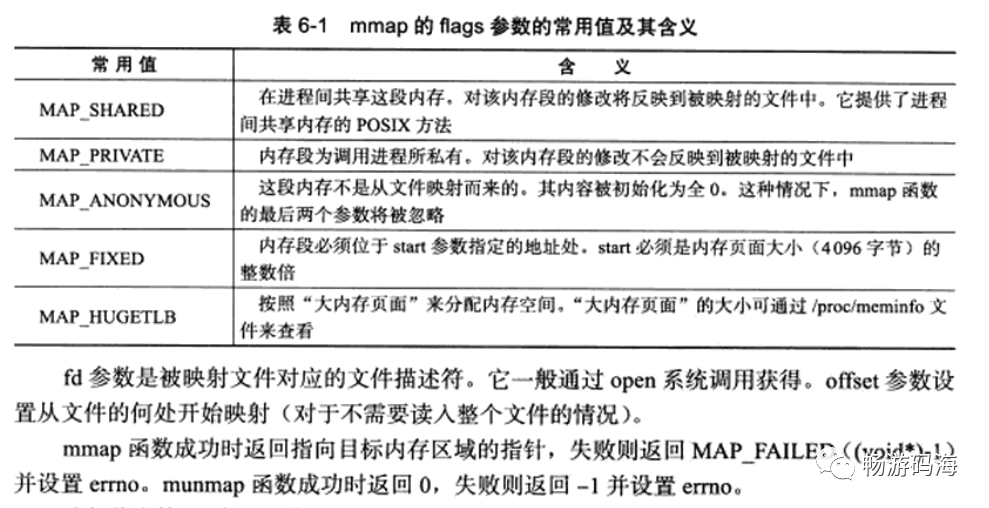`//用于申请一段内存空间 #include<sys/mman.h> void* mmap (void *start ,size_t length,int prot ,int flags ,int fd,off_t offest); int munmap (void *start,size_t length); //start允许用户使用特定的地址作为起始地址,length指定内存段的长度,port参数用来设置内存段的访问权限 //PROT_READ 内存段可读 //PROT_WRITE 内存段可写 //PROT_EXEC 内存段可执行 //PROT_NONE 内存段不能被访问`