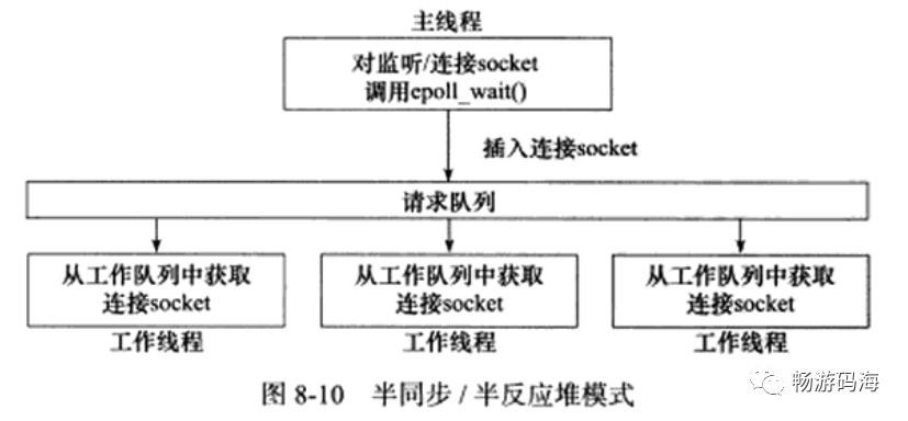 异步线程只有一个,由主线程来充当,它负责监听所有socket上的事件。如果监听socket上有可读事件发生------有新的连接请求到来,主线程就接受之以得到新的连接socket,然后往epoll内核事件表中注册该socket上的读写事件。如果连接socket上有读写事件发生----有新的客户请求到来或有数据要发送至客户端,主线就将该连接socket插入请求队列中。所有工作线程都睡眠在请求队列上,当有任务到来时,它们将通过竞争(比如申请互斥锁)获得任务的接管权。这种竞争机制使得只有空闲的工作线程才有机会来处理新任务,这是很合理的
