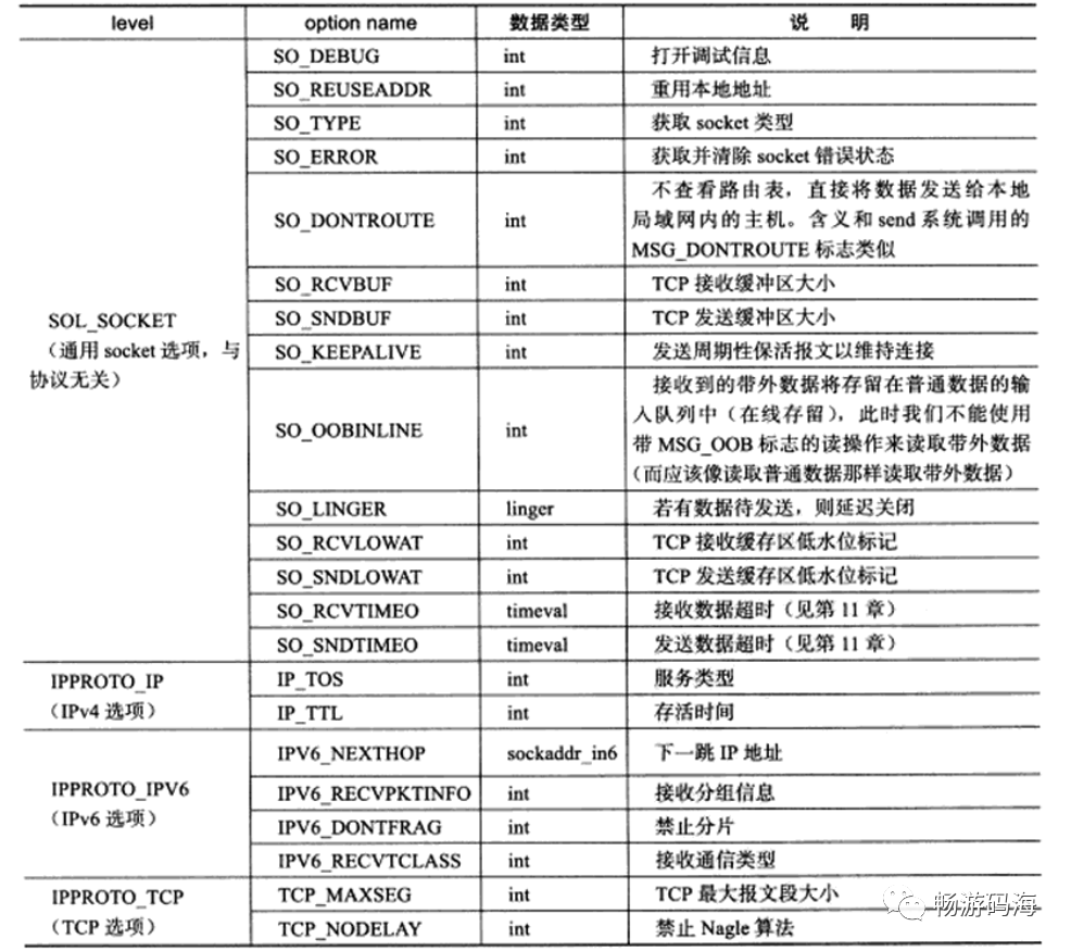 `#include<sys/socket.h> int getsockopt (int sockfd,int level,int option_name , void* option_value);//sockfd参数指定被操作的目标socket。level参数指定要操作哪个协议的选项,option_name参数则指定选项的名字 ,option_value和option_len参数分别是被操作选项的值和长度 int setsockopt (int sockfd , int level ,int option_name ,const void* option_value,socklen_t option_len);`