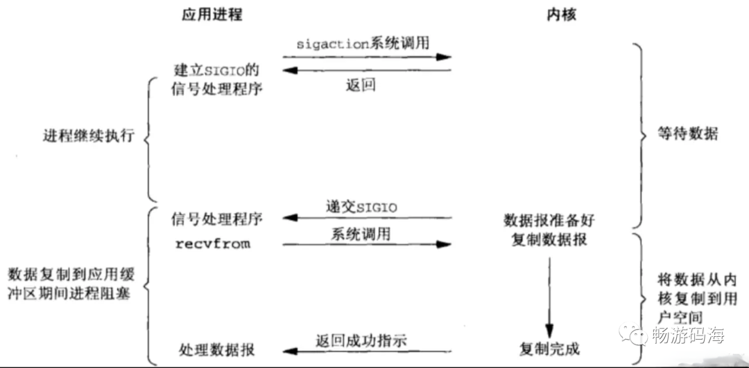 当socket上的数据被读入用户缓冲区后,内核将向应用程序发送一个信号,以通知应用程序数据已经可用