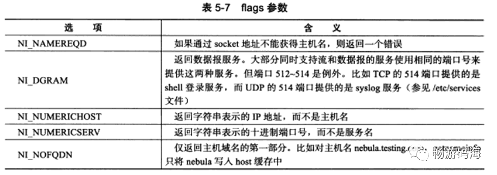 `//将返回的主机名存储在hsot参数指向的缓存中,将服务名存储在serv参数指向的缓存中,hostlen和servlen参数分别指定这两块缓存的长度 #include<netdb.h> int getnameinfo (const struct sockaddr* sockaddr,socklen_t addrlen,char* host,socklen_t hostlen,char* serv,socklen_t servlen,int flags);`