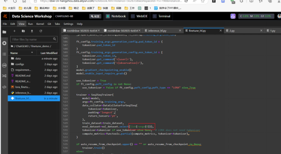 2.8将/mnt/workspace/chatGLM3/finetune demo目录下finetune hf.py文件源码的第530行eval dataset=val dataset.select(list(range(50)))代码中的iist(range(50))改为你实际dev.json 中的数据条数总数,比如我的只有7条,我就应该改为eval dataset=val dataset.select(list(range(7)))