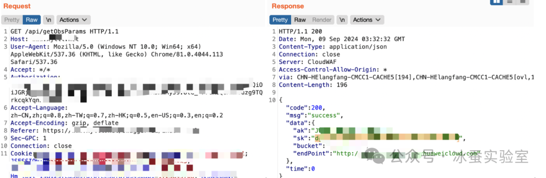 在众多接口信息中,发现getObsParams接口,可获取华为云 ak/sk