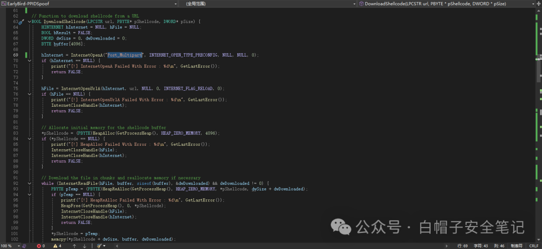 使用了DownloadShellcode函数从远程下载shellcode,从而降低熵值至6以下规避杀软,你可以自定义你的shellcode地址。