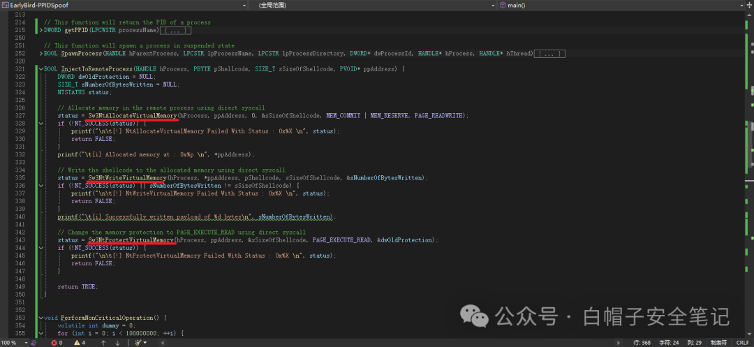 对申请内存、写入内存、内存保护进行了函数替换。为什么改这个函数,360可能会报可疑远程进程注入,使用直接系统调用免杀360。