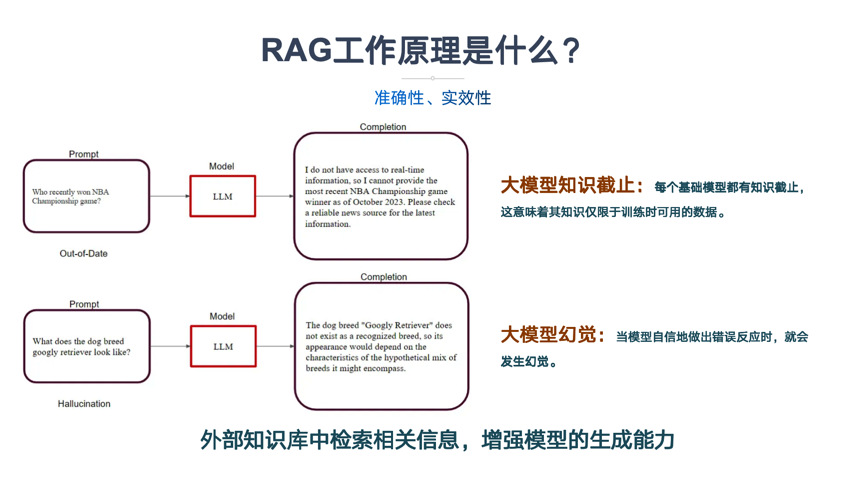 **RAG工作原理是什么?**大型语言模型(LLM)面临两个问题,第一个问题是LLM会产生幻觉,第二个是LLM的知识中断。