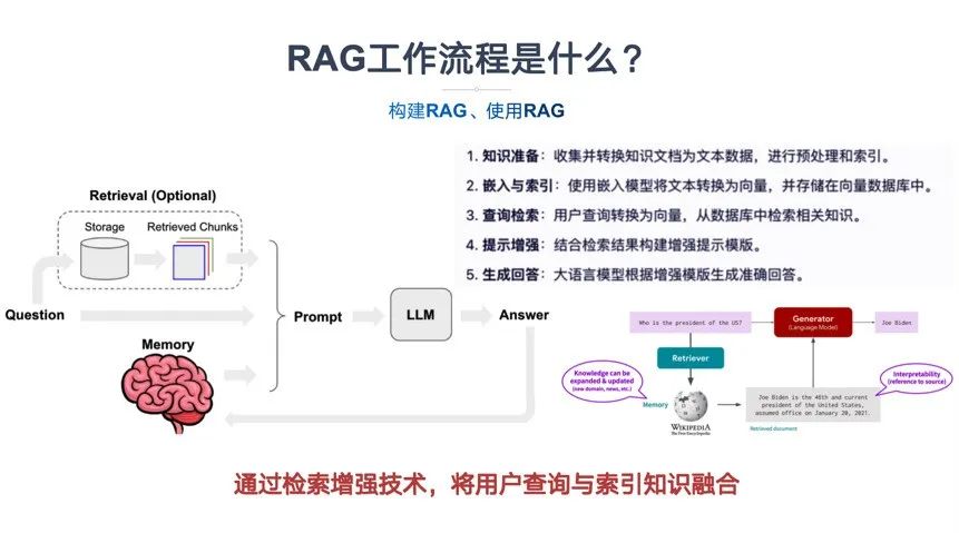 ****RAG工作流程是什么?通过检索增强技术,将用户查询与索引知识融合,利用大语言模型生成准确回答。